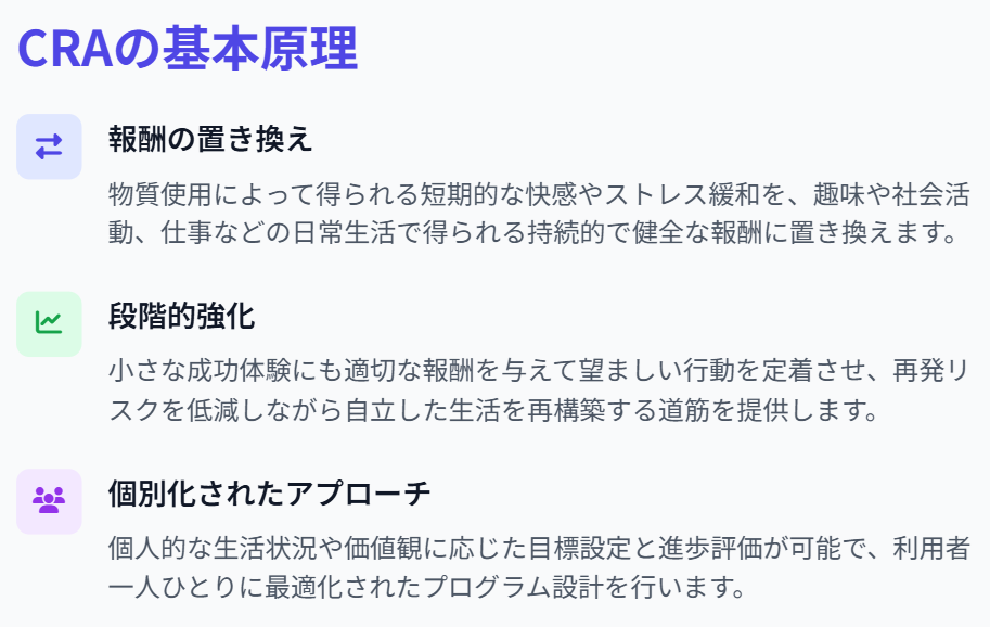 CRAは以下の要素を有機的に組み合わせることで、再発予防を図ります。まず初めに、物質使用の背景を分析し誘因と結果を可視化します。次に、物質以外の活動で得られる喜びや達成感を組み込んだ生活強化計画を作成し、コミュニケーションや問題解決、拒否スキルなど日常生活の実践的な能力を訓練します。そこから小さな成功体験に対して適切な報酬(強化)を与え、定期的な評価とフィードバックを通じてプログラムを調整しながら、望ましい行動パターンを定着させます。