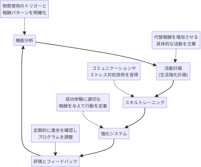この方法論の出発点となるのがオペラント条件付けの考え方です。人は“報酬が得られる行動”を繰り返しやすく、“報酬が得られない行動”は減少するという原理を応用し、物質使用のトリガーや使用後の効果を機能分析で明らかにしたうえで、趣味・運動・社会参加・仕事などから得られる代替的な“報酬”を計画的に増やしていきます。