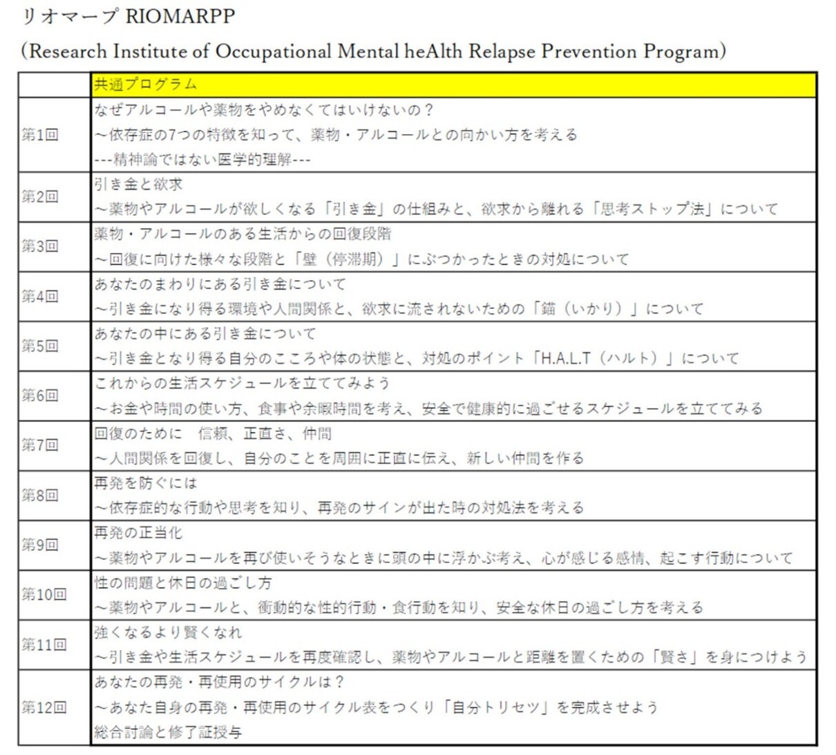 リオムメンタルクリニックでは現在、CRA自体は実施しておりません。その代わりに、通常の保険診療の枠組みで、当院の依存症再発予防プログラム『リオマープ』RIOMARPPを行っています。全12回分の資料(毎回用いるスライドの全ページを印刷したもの)を患者さん一人ひとりにお渡しし、各回の外来診療の中でポイントを説明して自宅で読み返して書き込みしてもらうスタイルを採用しています。初回では依存行動の歴史やメカニズムの説明といった導入から始まり、その後の継続的な通院の度に、衝動を引き起こす「引き金」の意識化やそれを遠ざけること、衝動を感じた際にも気分を切り替えて行動に移さないようにする心理学的手法など、依存症の再発リスクを低減する現実的な対処スキルを示した資料を活用して学習と振り返りを行っていきます。